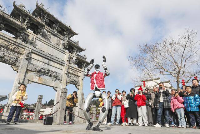 2026年2月18日,游客在安徽省黟县西递古村观看机器人表演。新华社发(施亚磊摄)