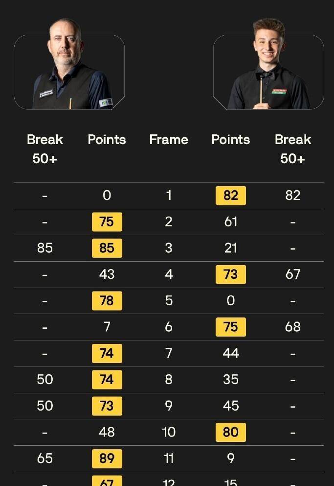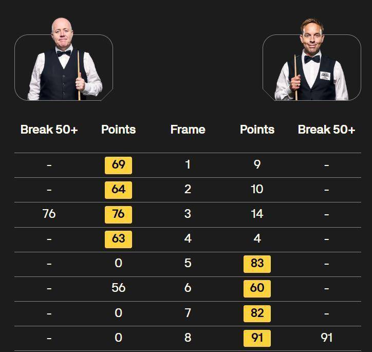 三届世界冠军“金左手”马克·威廉姆斯迎来了波兰新星安东尼·科瓦尔斯基的挑战。 比赛的上半场,经验丰富的马叔就牢牢掌控了局面,他打出了单杆85分、50分和50分,迅速建立了6比3的领先优势。 进入下半场,科瓦尔斯基虽然以80比48艰难扳回一局,但随后便无力阻挡威廉姆斯的攻势。