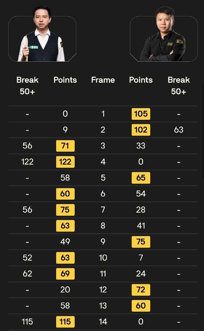 另一场焦点战在中国选手肖国栋与周跃龙之间展开,这是一场备受关注的“中国德比”。 比赛进程并非一帆风顺,周跃龙开局状态出色,凭借一杆63分连赢两局,取得了2比0的领先。 肖国栋并未慌乱,他在第三局回敬一杆56分,并在第四局轰出单杆122分的破百,将比分追成2比2平。
